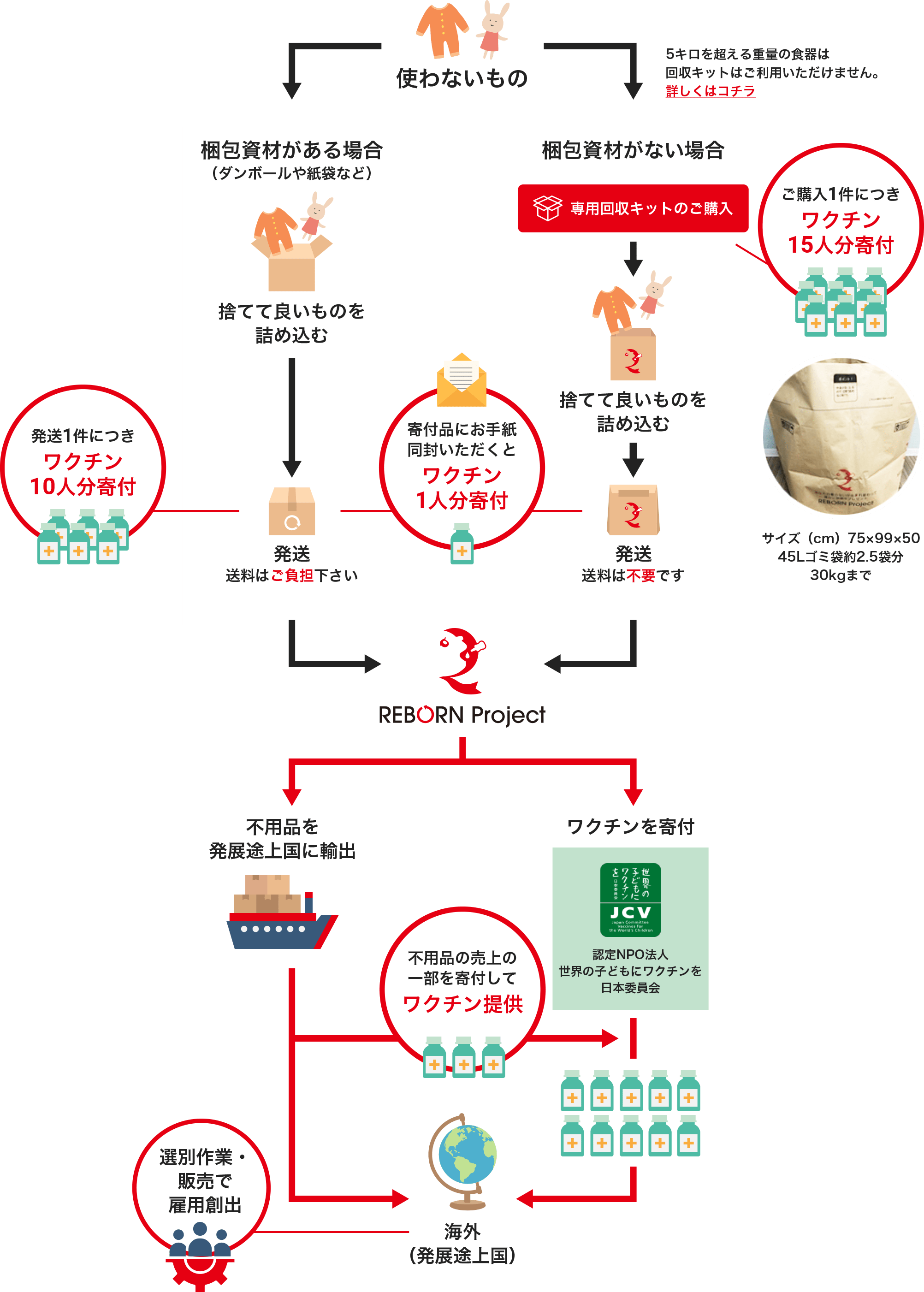 専用回収キットの紙袋のサイズは高さ75cm×胴幅99cm×幅底50cmとなります、45Lサイズのゴミ袋約2.5袋分程度の量が入る袋サイズとなります。専用回収キットのご購入※寄付品の専用回収キットは紙袋となりますので、重量5㎏を超える大量の食器をお送りいただく際はキットのご利用は控えていただけますと幸いでございます。ご自身で段ボールをご用意いただき割れないように梱包していただき発送をお願いします。