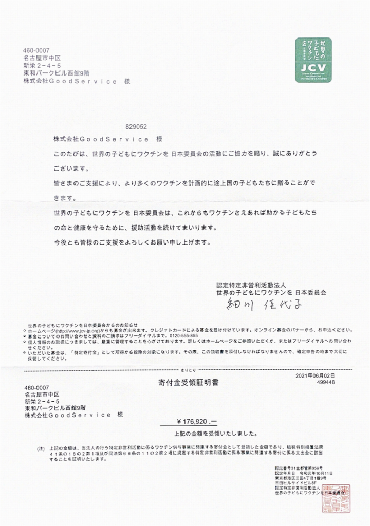 6月2日に認定NPO法人世界の子供にワクチンを日本委員会へ176,920円寄付させていただきました。